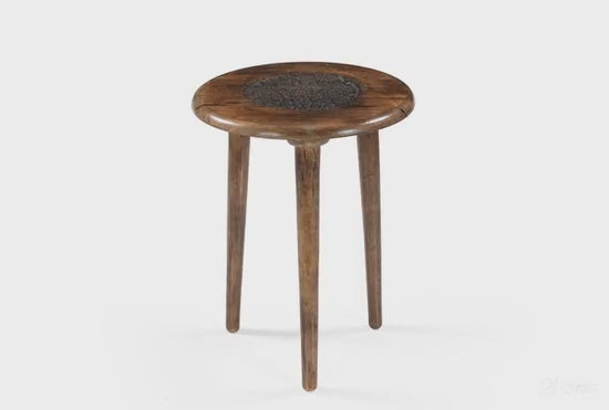 Verleihen Sie Ihrem Zuhause Wärme und Charakter mit diesem handgefertigten Beistelltisch aus rustikalem Massivholz. Die wunderschön geschnitzte Mandala-Tischplatte und die drei organisch geformten Holzbeine machen ihn zu einem perfekten Boho-Akzentstück für jeden Raum.