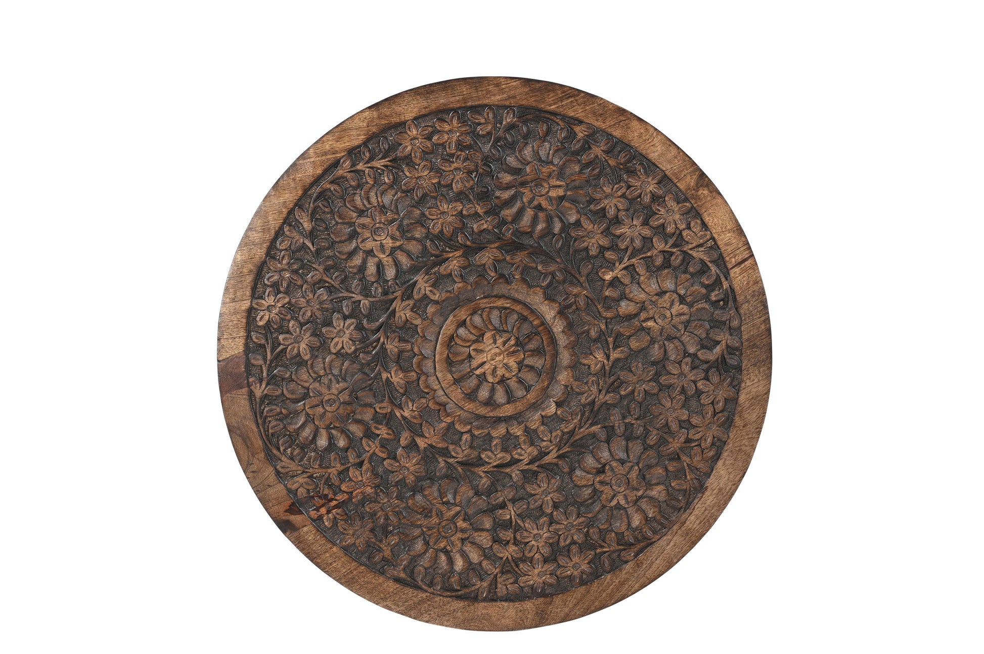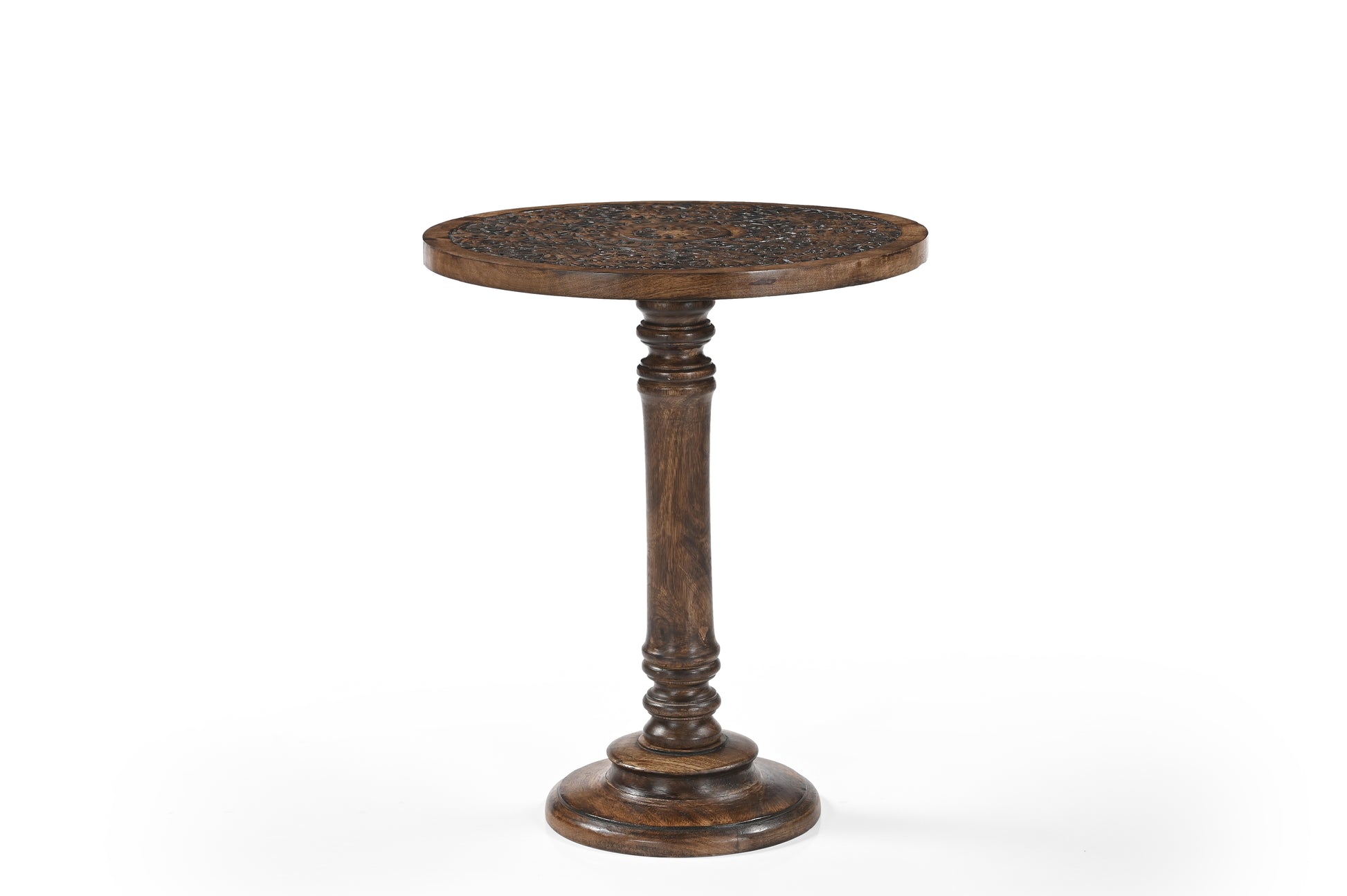 iAnanas Antique Brown Hand-Carved Round Side Table with Embellishments – Mango Wood