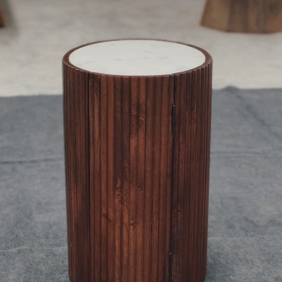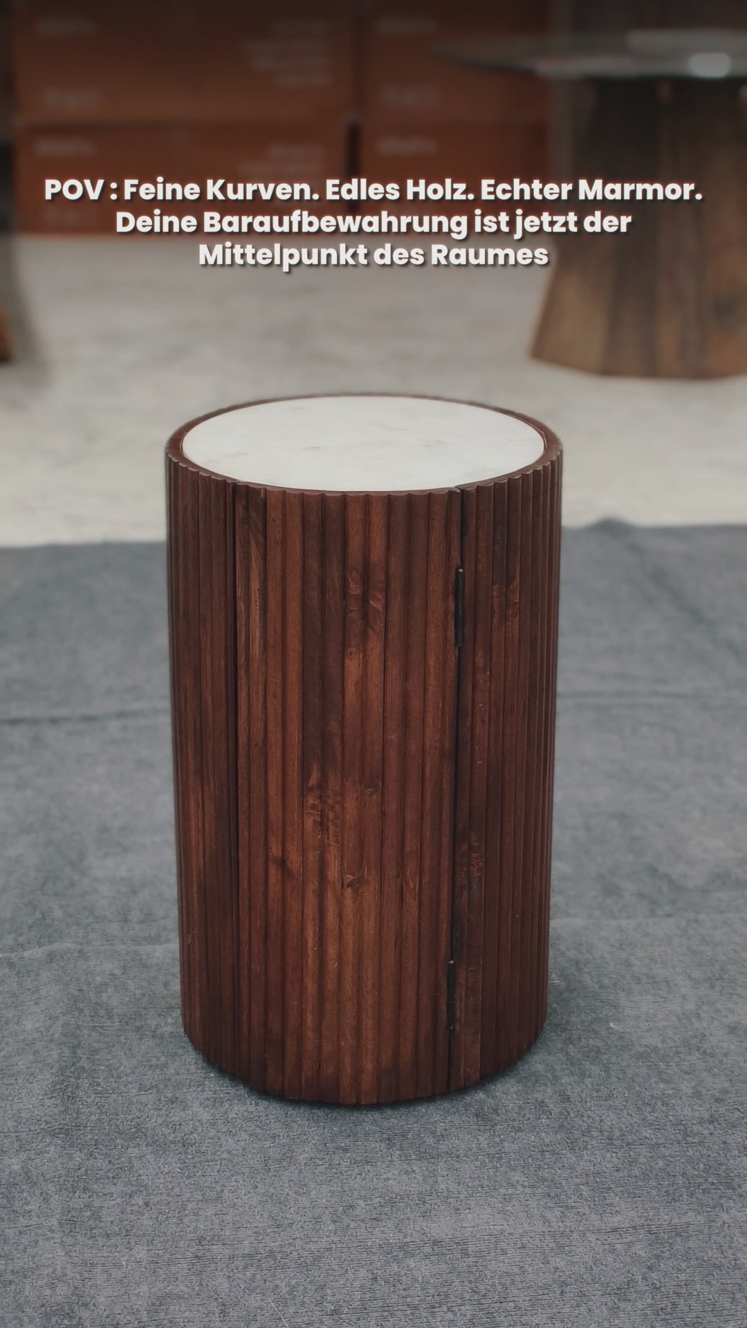 Moderner zylindrischer Barschrank aus Holz mit weißer Marmorplatte – Kompakte Aufbewahrung für den Stehtisch